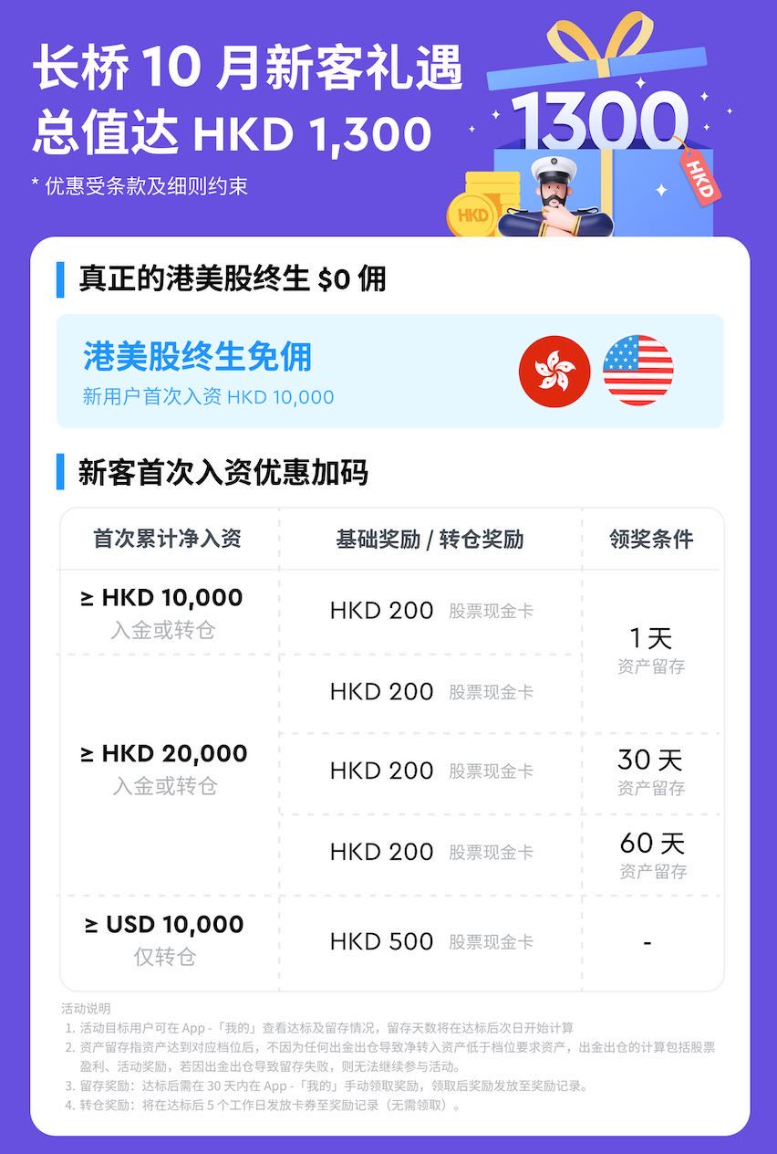 10月份使用上方邀请码开户并入金即可获得下方奖励,即入金2w可拿600hkd并享受港股美股终生免佣