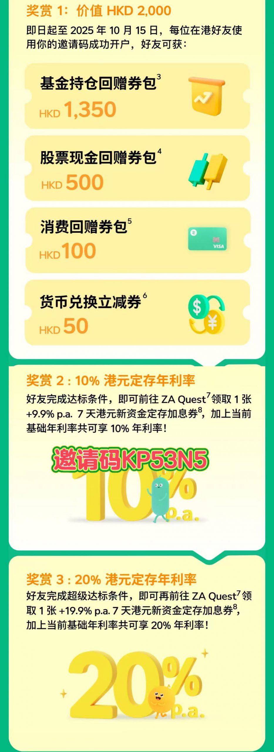 开户后完成ZA Quest任务可获得积分奖励,积分可直接兑换成现金,每连续签到7天也有积分或加息券等奖励。