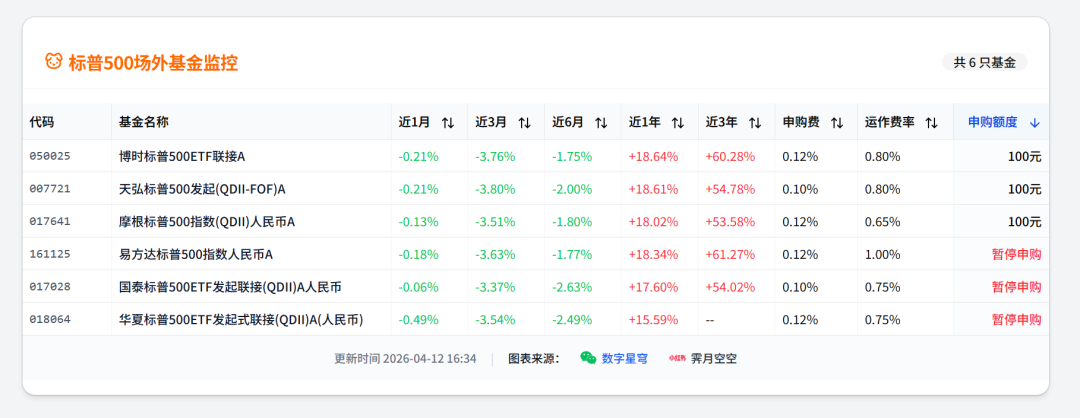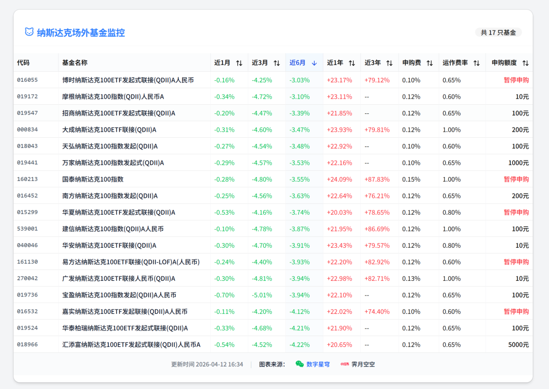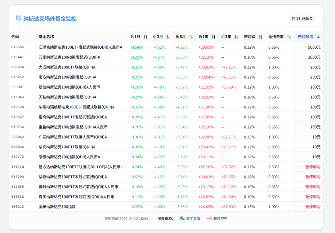 因为需求比较大,所以搓了一个小工具,下面整理了最新的场外纳斯达克基金每日可申购额度,包括最近的涨跌幅,管理费等指标。因为现在主要用狗东和微众,所以本图表只整理了代销渠道的A类基金,直销渠道的未纳入。