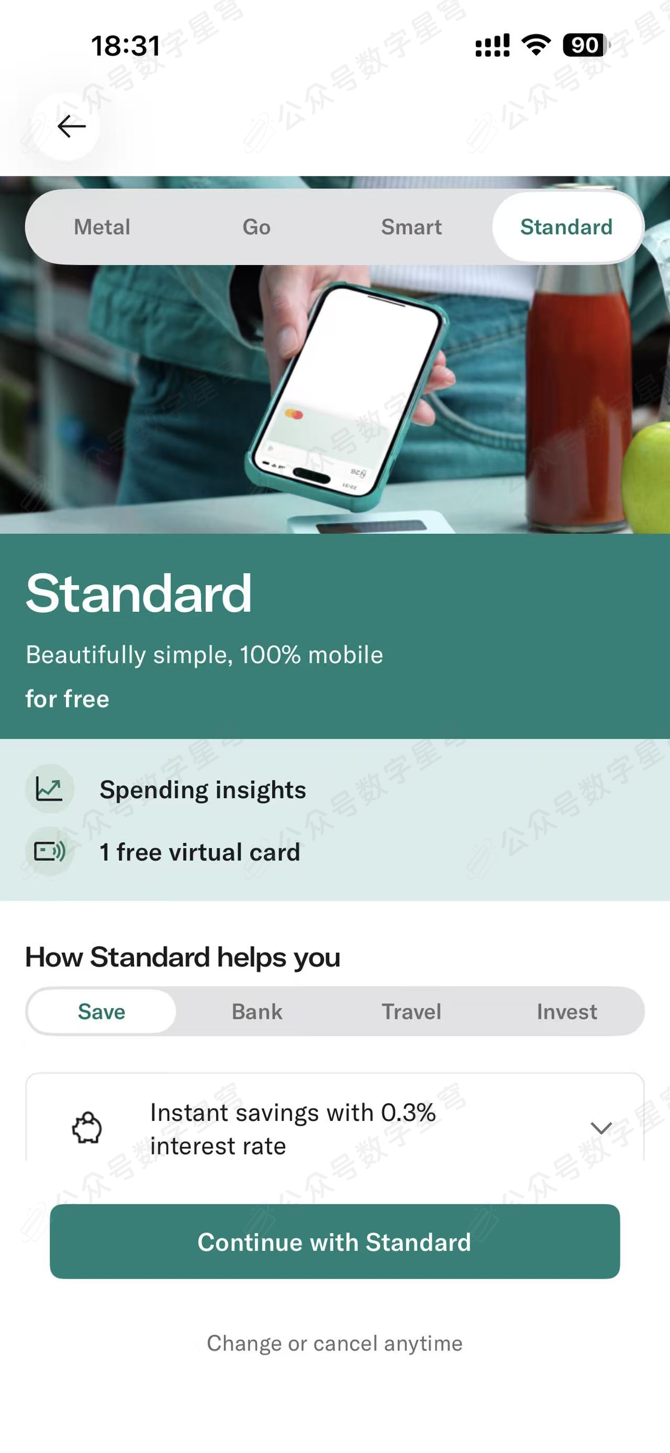 标准账户完全免费,提供免费虚拟卡,可绑定apple pay。